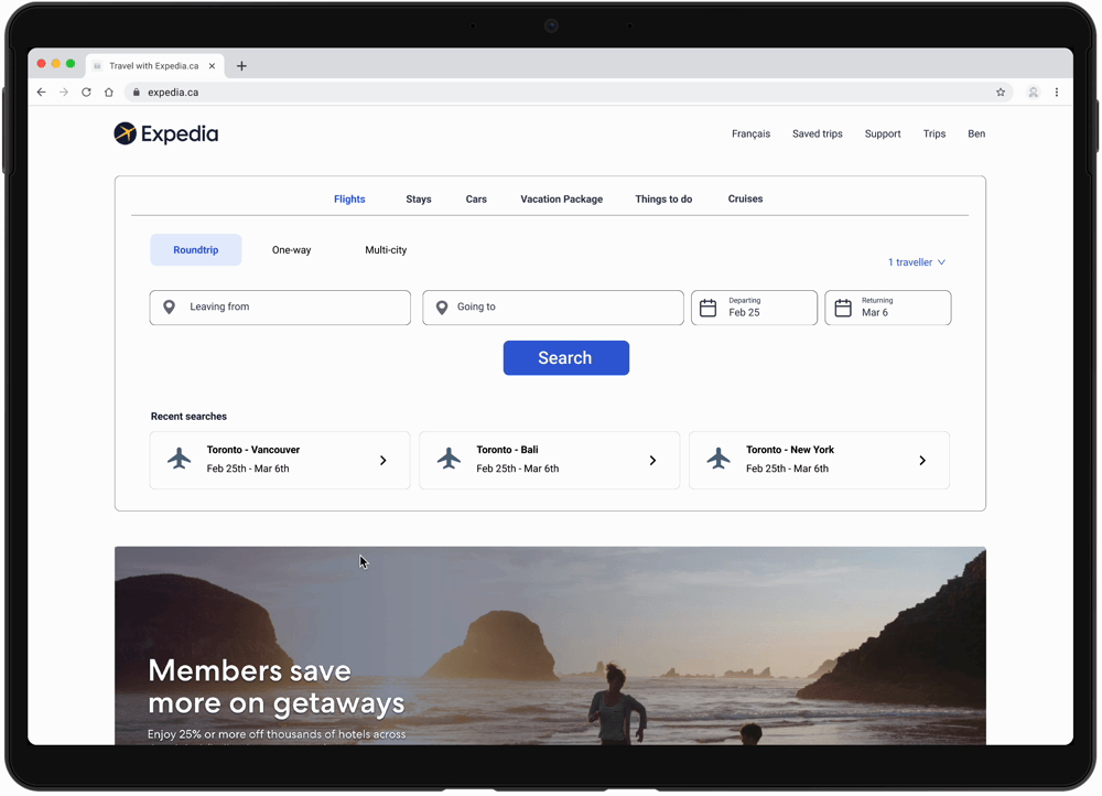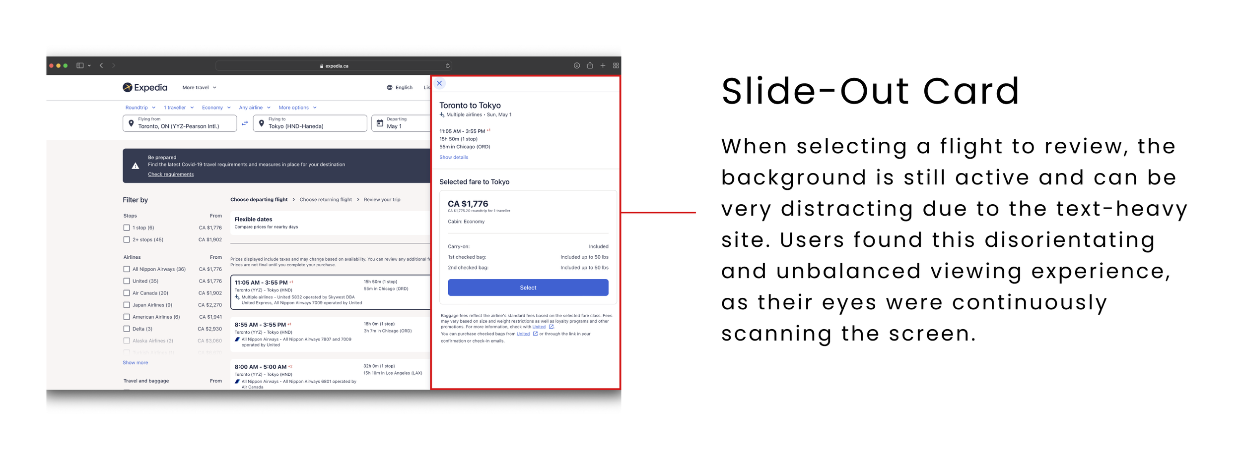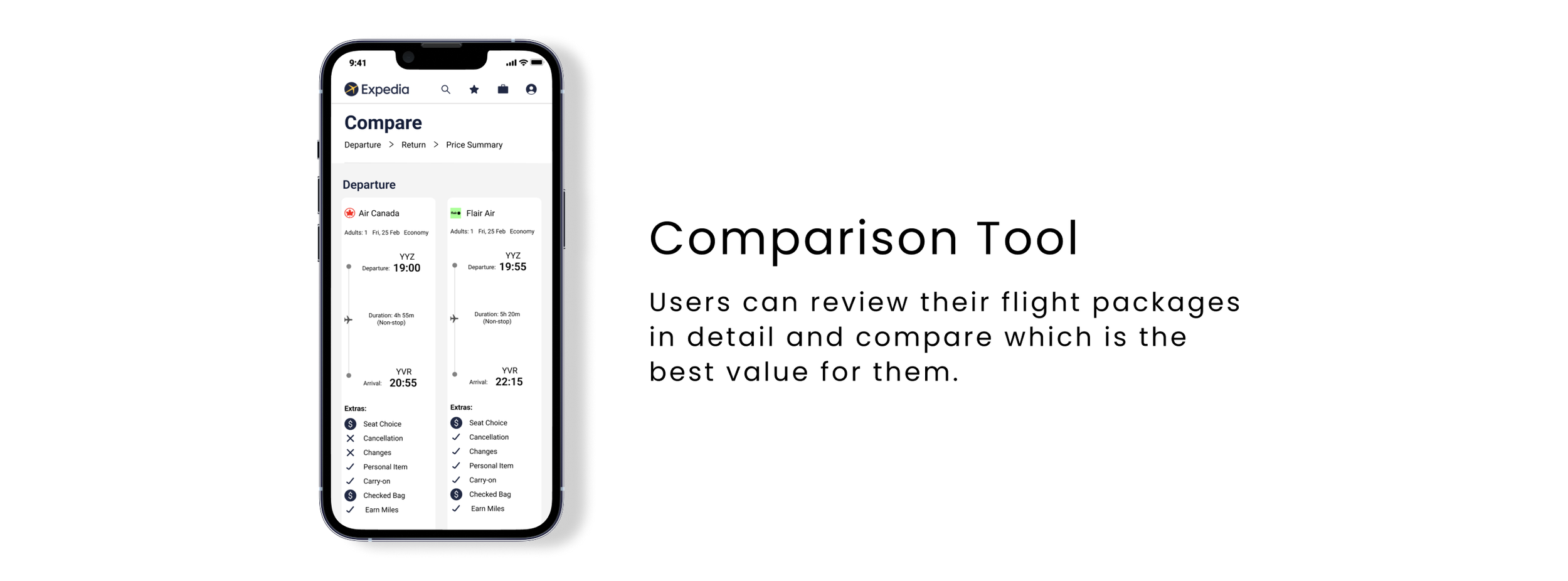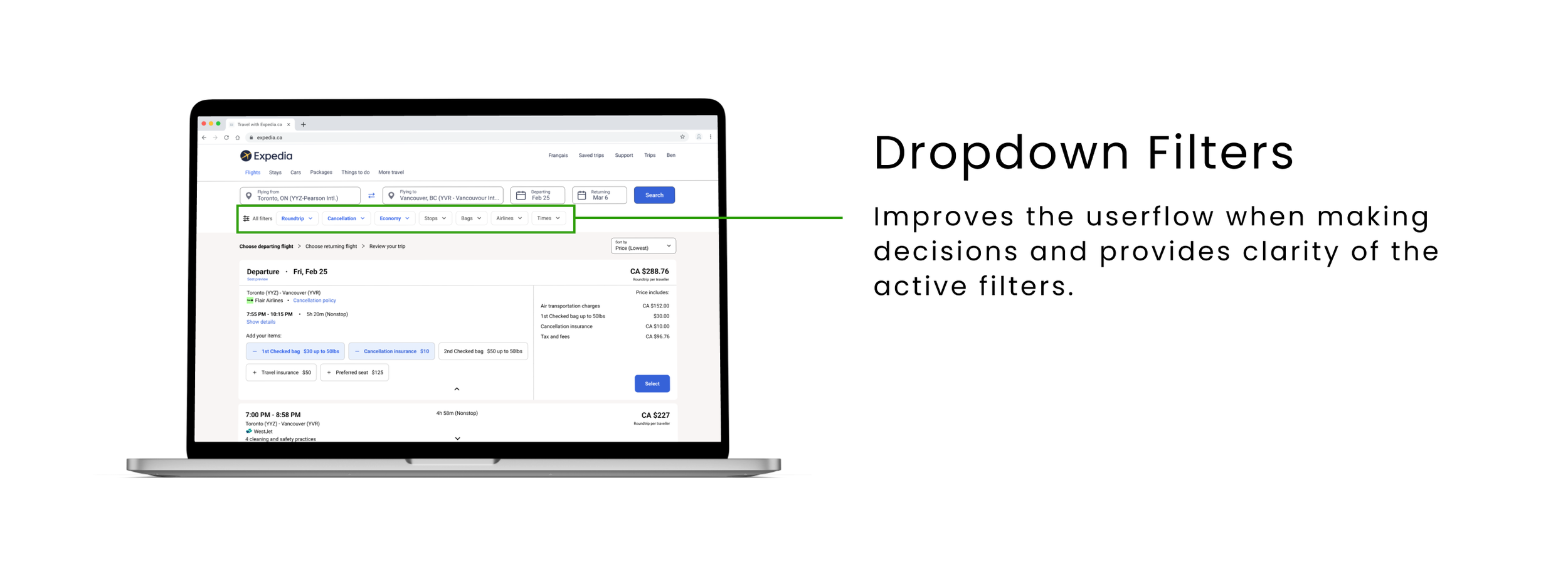 Our goal is to empower travellers to purchase flights in the quickest and most efficient way. How might we implement an informative and transparent purchase experience for travellers to feel confident in their flight purchase without leaving Expedia?