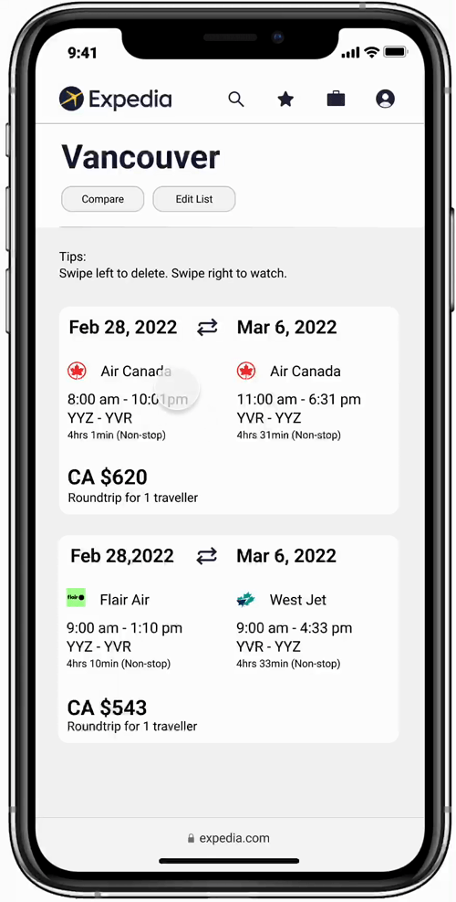 Many travellers spend anywhere from 1-3 weeks making a purchase decision on their airfare, searching and revisiting the Expedia website for the best flight option that meets their preferences. More than 70% of travellers can be identified as Informed Consumers when making flight purchase decisions. For travellers to collect flight information, they need to repetitively enter the same flight details and preferences to review their options.