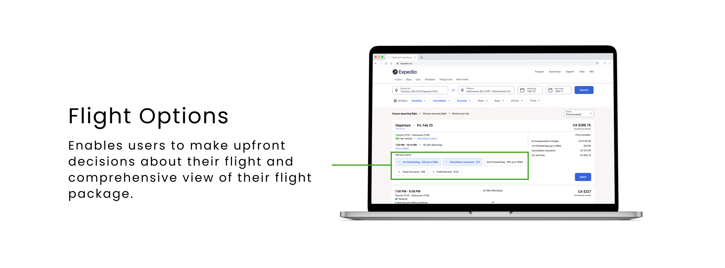 Enables users to make upfront decisions about their flight and comprehensive view of their flight package.
